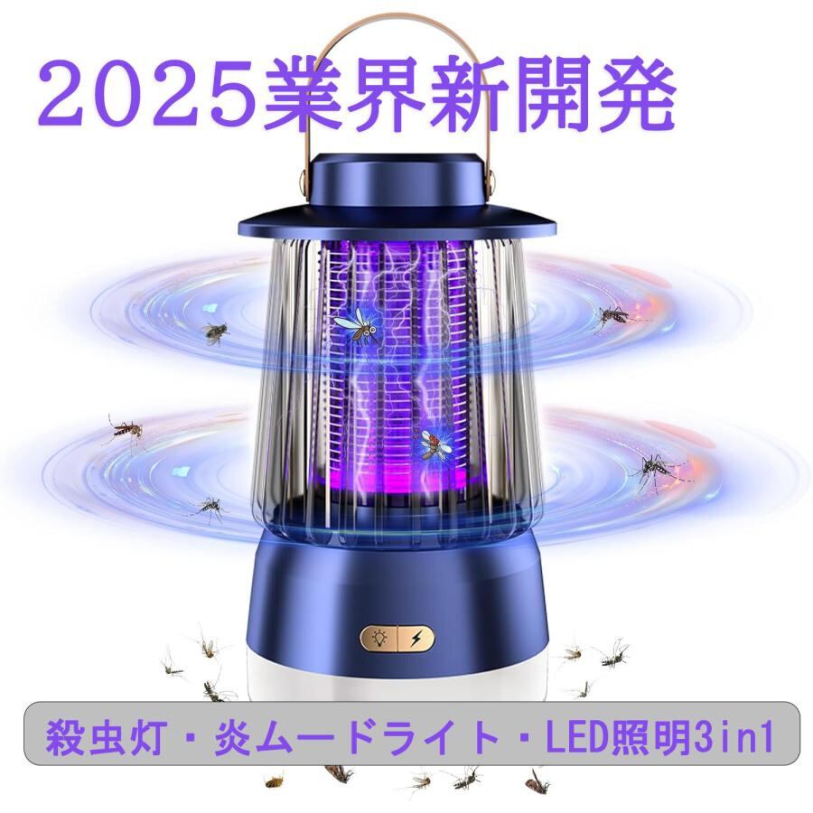\2025業界新開発・殺虫灯・炎ムードライト・LED照明3in1/ 電撃殺虫器 充電式 コバエ取り 蚊取り器 360°強力 捕虫器 多機能 誘蛾灯 USB充電 3000mAh大容量バッテリー IP5X防水 静音 無害 省エネ経済 屋外/屋内/キャンプ/停電などに適